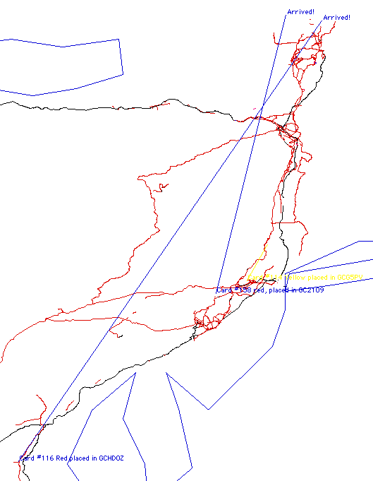 This map shows the movement of most cards as of January 2005 that have moved anywhere in the US. Some cards have gone in the wrong direction! Note that there are two lines coming out of virginia one going north (red) and one going south (purple). Cards started in Tennessee, New Jersey, and Virginia.